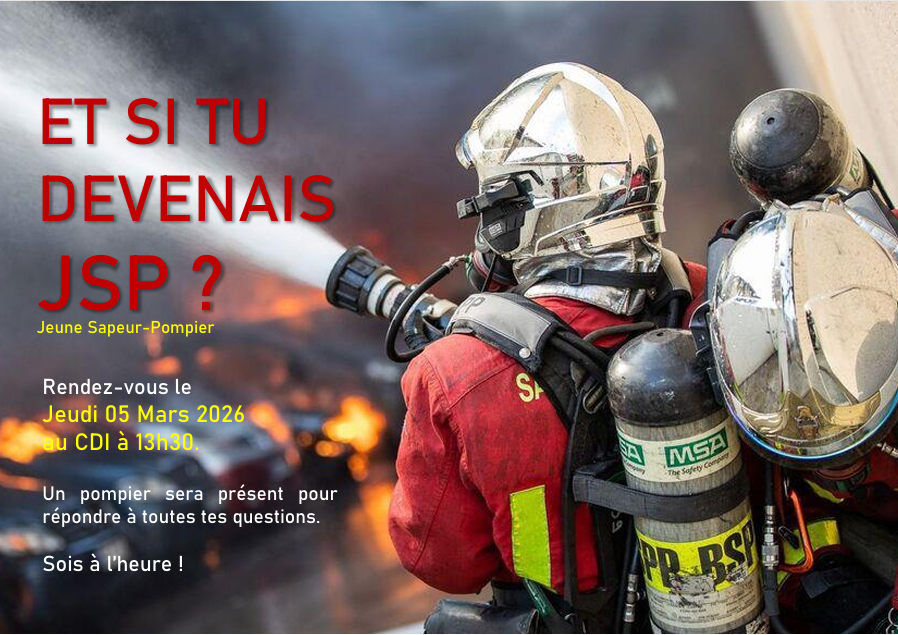 La campagne de recrutement des JSP est ouverte. Tu es intéressé(e) ? Viens à la rencontre d’une JSP et d’un pompier jeudi 05 Mars 2026 à 13h30 au CDI.